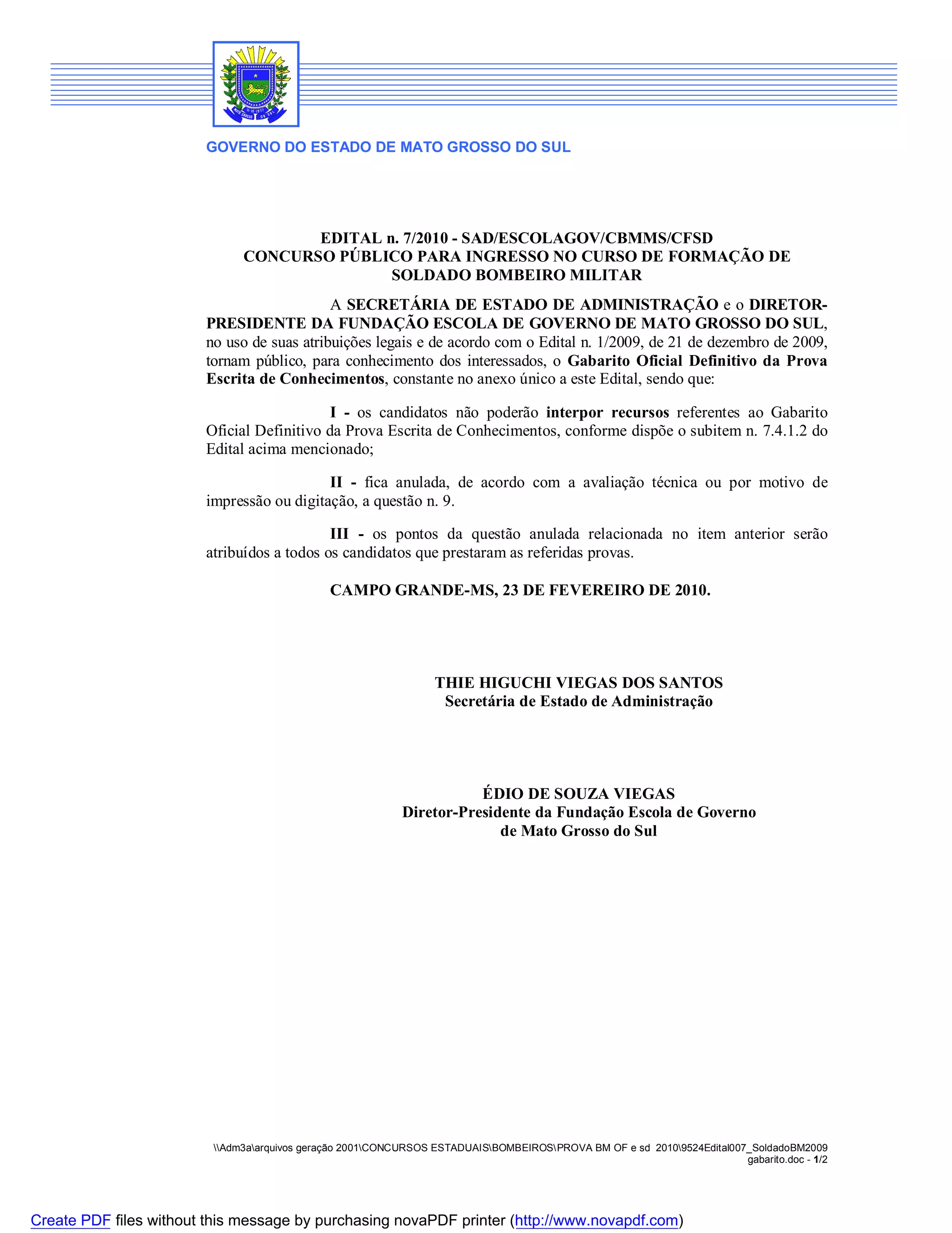 Este documento divulga o gabarito oficial definitivo da prova escrita de conhecimentos para o concurso público de soldado bombeiro militar no estado de Mato Grosso do Sul. A questão 9 foi anulada e os pontos serão atribuídos a todos os candidatos. Os candidatos não podem recorrer do gabarito oficial.