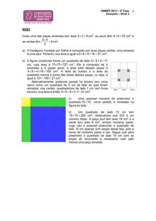 O documento apresenta soluções para exercícios de matemática da OBMEP 2013 nível 2. As soluções envolvem: 1) Cálculo do número associado a uma palavra através de uma tabela de correspondência entre letras e números; 2) Análise da fatoração de números para determinar se é possível formar palavras com números associados iguais a esses números; 3) Cálculo de áreas de figuras formadas por peças geométricas.