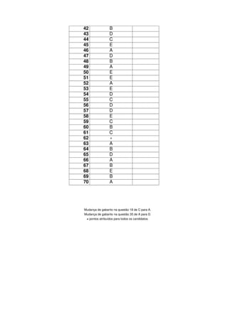 Este documento fornece o gabarito oficial definitivo de uma prova chamada POSCOMP 2011, contendo as alternativas corretas para cada uma das 70 questões, além de informar mudanças nos gabaritos das questões 18 e 35.