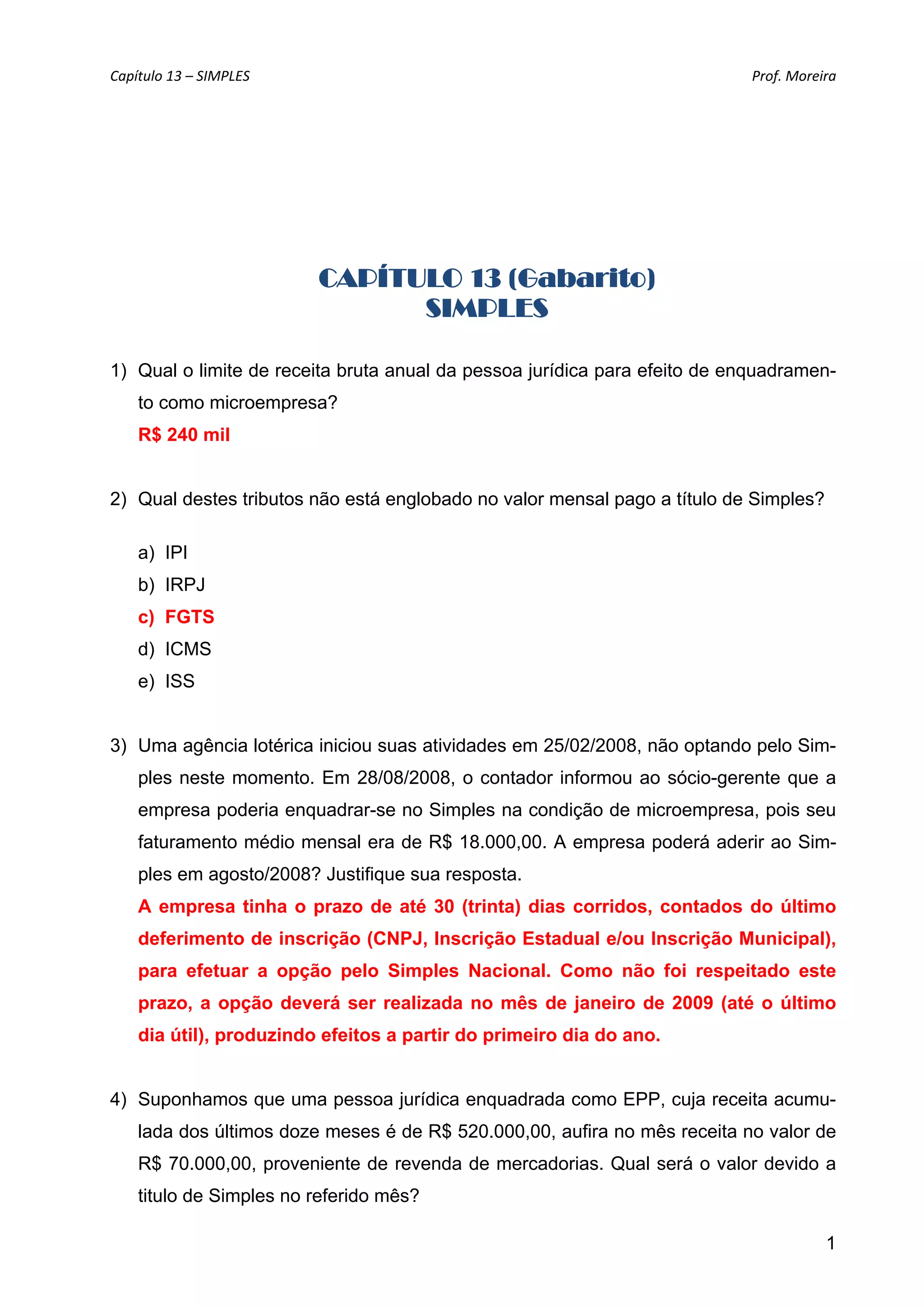 O documento apresenta um capítulo sobre o regime tributário Simples Nacional, com perguntas e respostas sobre: 1) o limite de receita bruta anual para enquadramento como microempresa no Simples é de R$240 mil; 2) o valor devido a título de Simples para uma empresa do ramo de comércio com receita de R$70 mil no mês; 3) atividades permitidas e vedadas para opção pelo Simples.