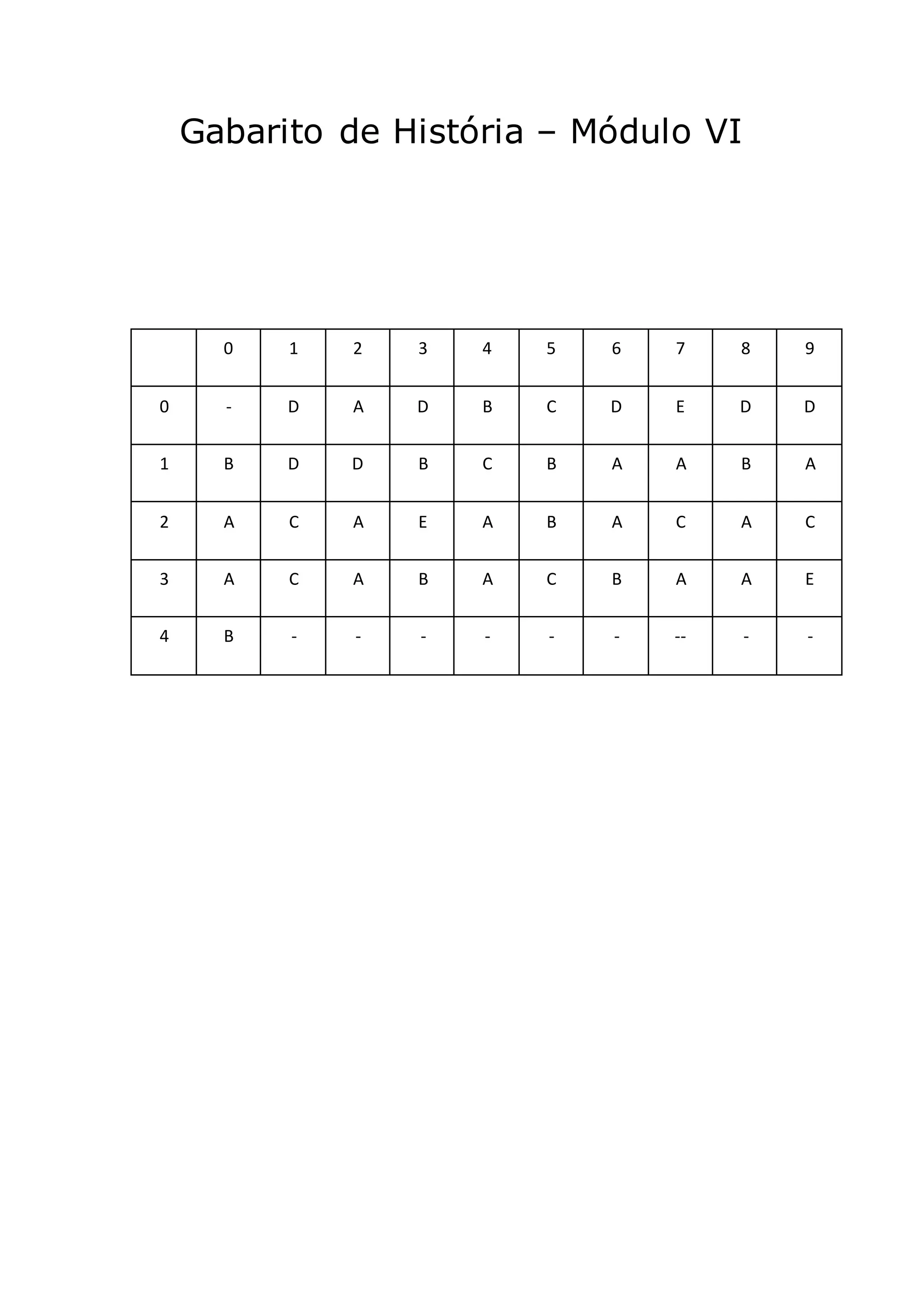A tabela apresenta as respostas corretas para um teste de múltipla escolha de História dividido em 10 questões, com as letras A-E representando as alternativas para cada questão.