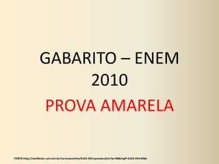 O documento apresenta o gabarito da prova amarela do ENEM de 2010. Ele contém as respostas corretas para cada questão da prova, identificadas pela letra correspondente à alternativa correta.