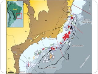 CARVÃO MINERAL Noterritório brasileiro esse minério é encontrado em áreas restritas e limitadas, além disso, o carvão extraído não possui boa qualidade , pois apresenta baixo poder calórico e quantidade de cinza elevada. Por essa razão não possui viabilidade quanto à sua utilização como fonte de energia e matéria-prima nas siderúrgicas. No Estado de Santa Catarina é realizada a maior produção de carvão, com destaque para o vale do rio Tubarão, nessa jazida o minério é totalmente aproveitado pelas indústrias siderúrgicas, geralmente localizadas na região Sudeste. BACIA SEDIMENTAR DE CAMPOS É a bacia petrolífera que mais produz na margem continental brasileira, respondendo atualmente por mais de 80% da produção nacional de petróleo. A exploração da Bacia de Campos ganhou impulso em 1974, com a descoberta do Campo de Garoupa. Entretanto, a sua produção comercial predominantemente de petróleo pesado teve início somente em 1977, no Campo de Enchova.