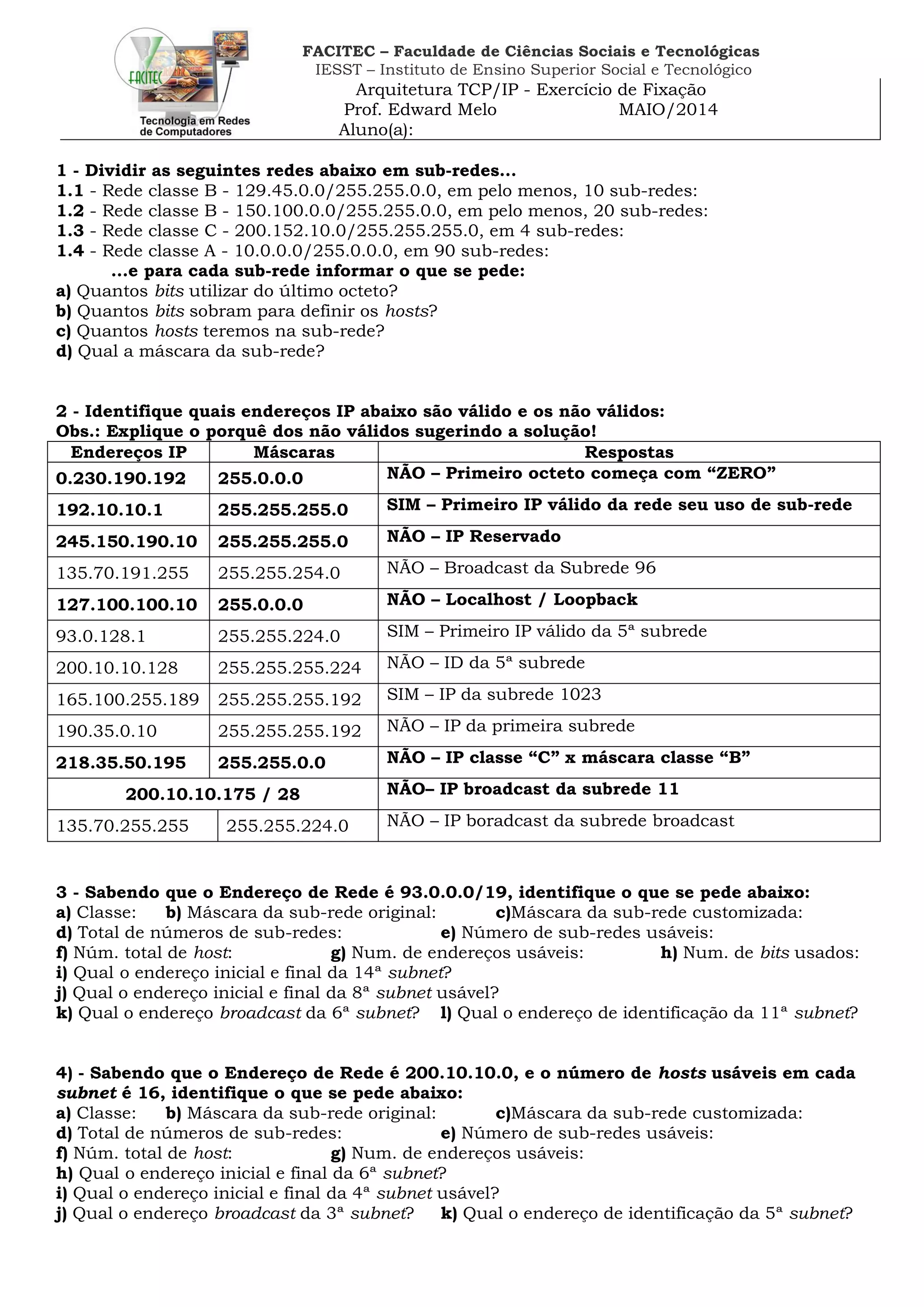 Este documento apresenta um exercício sobre divisão de redes IP em sub-redes. O aluno deve dividir quatro redes em classes diferentes em várias sub-redes, informando para cada sub-rede a quantidade de bits do último octeto utilizados, quantos bits sobram para hosts, quantidade de hosts possíveis e máscara da sub-rede. O aluno também deve identificar quais dos endereços IP listados são válidos e inválidos e fornecer soluções para os inválidos. Por fim, o aluno deve identificar informações técnicas sobre sub-redes