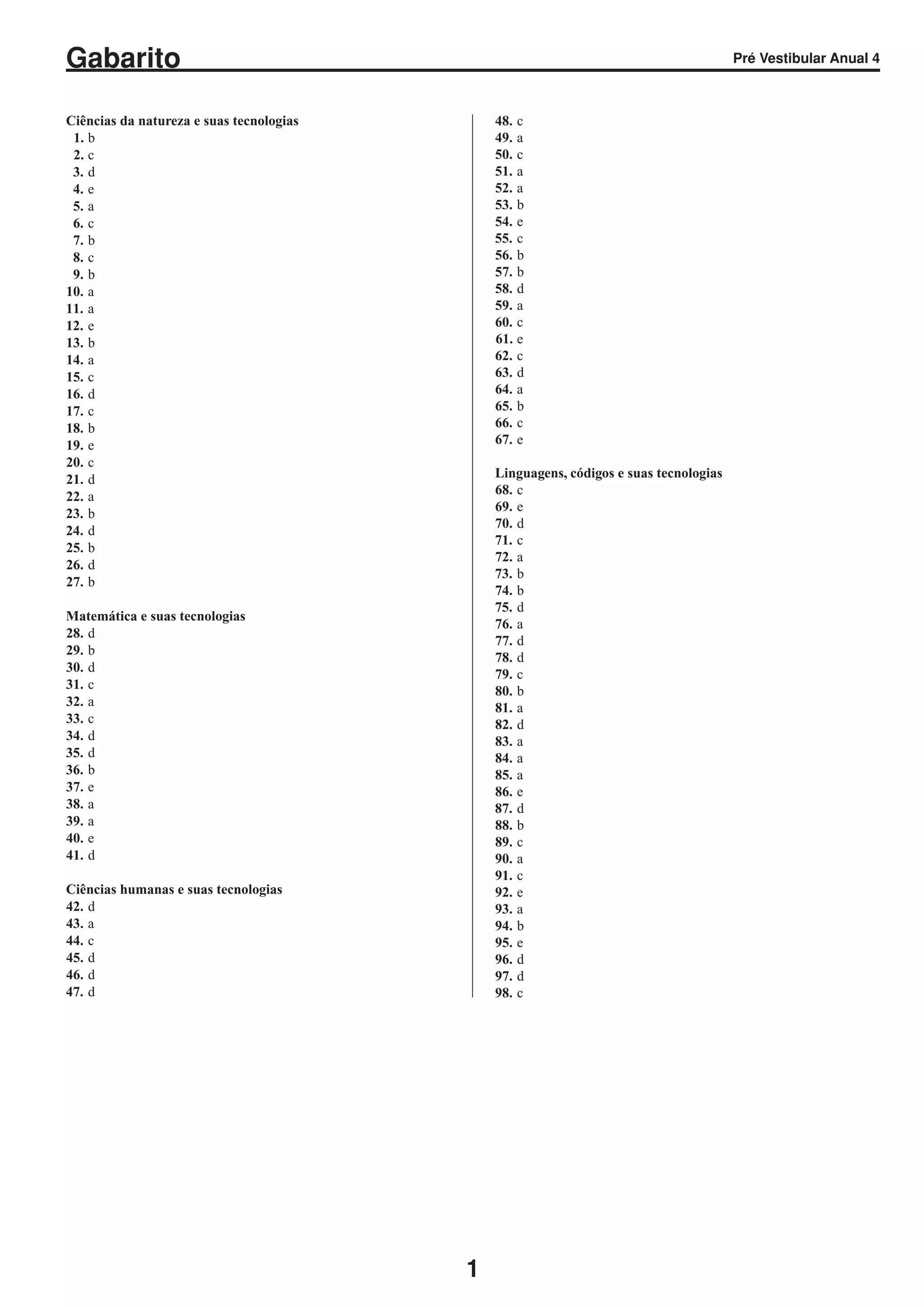O documento apresenta um gabarito de prova com 98 questões divididas em quatro áreas do conhecimento: Ciências da natureza e suas tecnologias (questões 1-27), Matemática e suas tecnologias (questões 28-41), Ciências humanas e suas tecnologias (questões 42-67), e Linguagens, códigos e suas tecnologias (questões 68-98). Para cada questão é apresentada a alternativa correta como a, b, c, d ou e.
