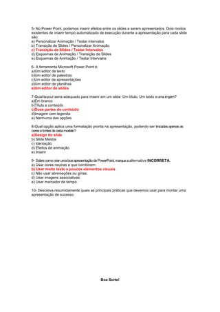 Este documento fornece um teste de avaliação teórica sobre o Microsoft PowerPoint 2007, contendo 10 questões sobre os recursos e funcionalidades do programa. As questões abordam tópicos como formatos de arquivo compatíveis, teclas de atalho para iniciar apresentações, modos de visualização, ocultação de slides, inserção de efeitos entre slides, ferramentas do programa, layouts de slides e boas práticas para criar apresentações.