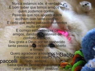 O documento fala sobre a importância de ter amigos que apoiam nos momentos difíceis. A autora diz que, apesar de estar passando por momentos difíceis, tem o apoio e conforto de bons amigos. Ela agradece a Deus por ter conhecido pessoas boas com coração aberto e que estão sempre ao seu lado para apoiá-la.