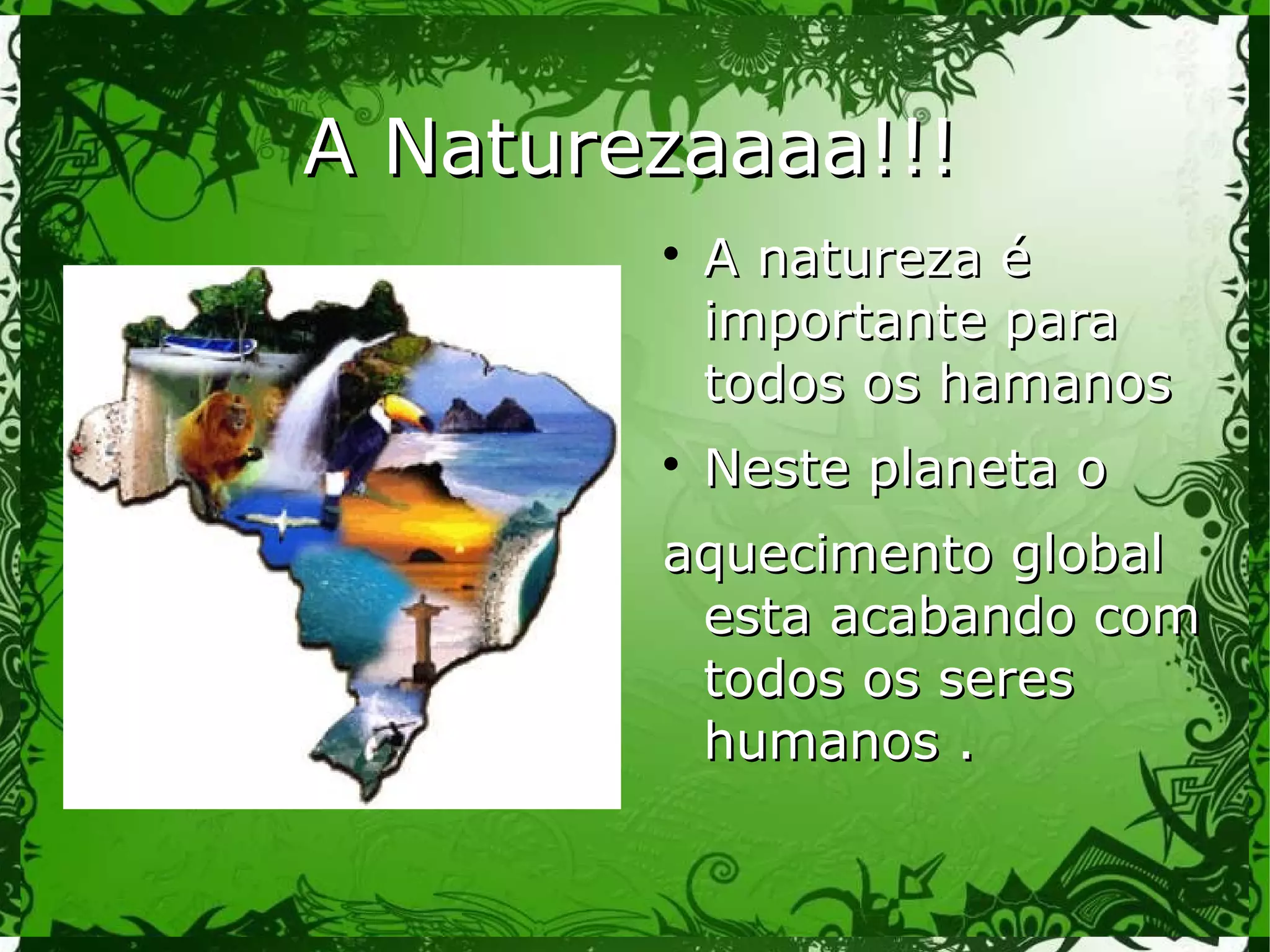 A natureza é importante para todos os seres humanos. O aquecimento global está acabando com todos no planeta. Estados Unidos e Europa poluem muito o meio ambiente, principalmente a Europa, e precisamos tomar medidas agora para proteger o planeta, como jogar lixo no lixo e não no chão.