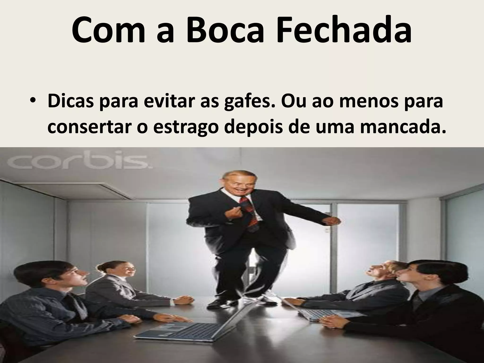 O documento fornece dicas para evitar gafes ao conversar, como falar menos e pensar mais, evitar generalizações e assuntos controversos. Também dá conselhos sobre como se remediar após uma gafe, como pedir desculpas na hora e compartilhar o erro com amigos.