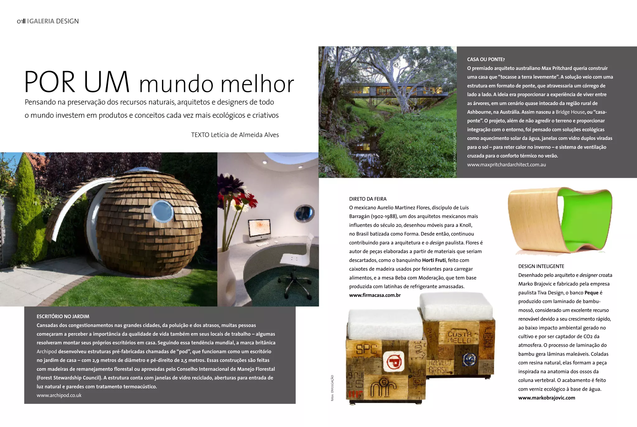 O documento discute vários projetos de design sustentável e ecológico, incluindo estruturas pré-fabricadas para escritórios no jardim, móveis feitos de materiais reciclados como latinhas e madeira reaproveitada, e soluções de iluminação e sistemas hidráulicos eficientes.