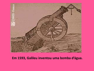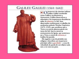 O documento descreve a vida e realizações de Galileu Galilei, um cientista italiano do século XVI. Ele nasceu em Pisa em 1564 e fez descobertas importantes em mecânica e astronomia usando telescópios que ele construiu. Sua teoria heliocêntrica entrou em conflito com a Igreja Católica e ele foi julgado pela Inquisição.