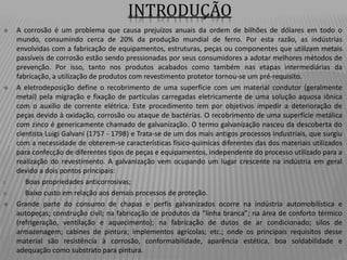 O documento descreve os processos de galvanização, incluindo a galvanização a fogo, metalização e galvanização eletrolítica. A galvanização a fogo envolve mergulhar peças aquecidas em um banho de zinco fundido para formar uma camada protetora. A metalização projeta partículas de zinco fundido na superfície. A galvanização eletrolítica deposita zinco em uma superfície usando uma corrente elétrica. Todos os métodos formam uma camada de zinco que protege o
