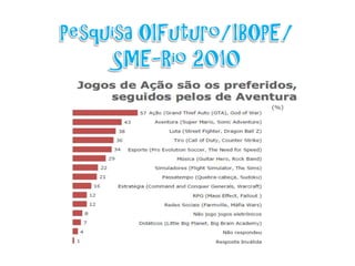 O documento discute o potencial dos jogos eletrônicos na educação, comparando como os jogos podem ser usados de forma conservadora, reformadora ou inovadora. Também apresenta exemplos de como os jogos podem estimular aprendizagem tangencial e colateral fora do ambiente escolar.