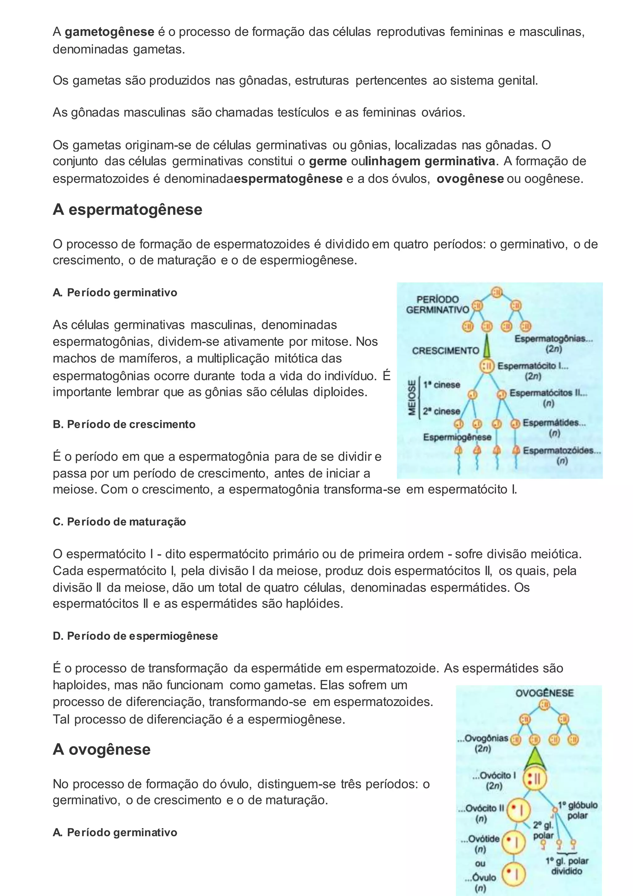 A gametogênese é o processo de formação dos gametas masculinos (espermatozoides) e femininos (óvulos) nas gônadas. A formação dos espermatozoides é chamada de espermatogênese e ocorre nos testículos, enquanto a formação dos óvulos é a ovogênese e ocorre nos ovários. Tanto a espermatogênese quanto a ovogênese envolvem períodos de multiplicação celular, crescimento e maturação das células germinativas.