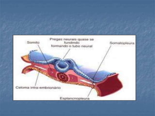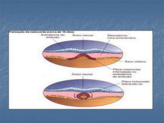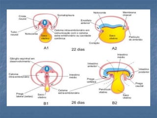 O documento descreve as principais etapas da embriogênese, incluindo a fecundação, clivagem, formação da mórula e blástula, gastrulação e neurulação. Também discute os principais anexos embrionários como o âmnio, saco vitelino, alantóide e placenta, e suas funções no desenvolvimento do embrião.