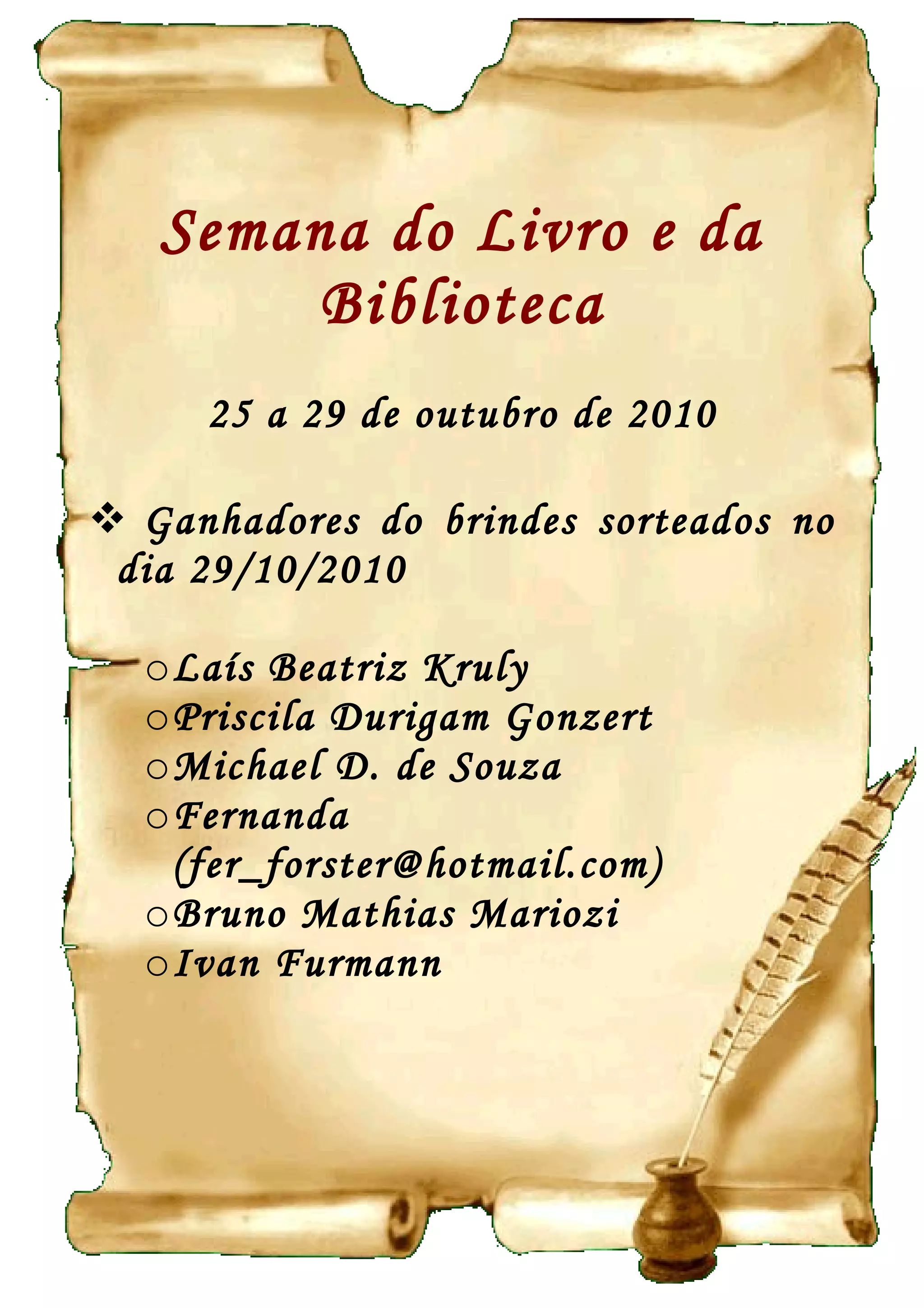 Uma escola realizou uma Semana do Livro e da Biblioteca de 25 a 29 de outubro de 2010, com sorteios diários de brindes. Os ganhadores dos sorteios do dia 29 de outubro foram: Laís Beatriz Kruly, Priscila Durigam Gonzert, Michael D. de Souza, Fernanda (fer_forster@hotmail.com) e Bruno Mathias Mariozi.