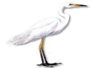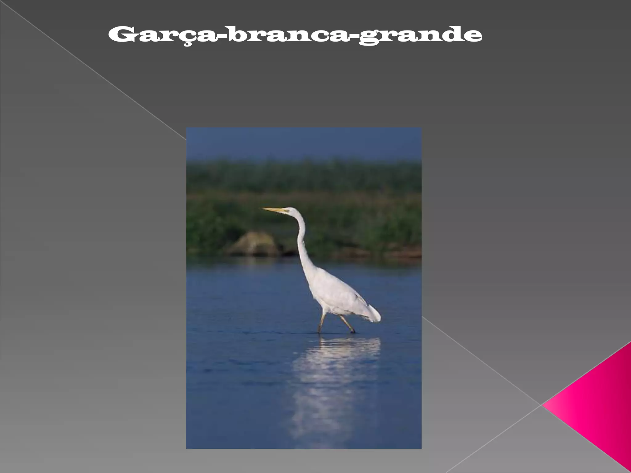 A garça-branca-grande é uma ave da ordem Pelecaniformes encontrada em todo o Brasil. Ela é completamente branca com bico, pernas e dedos amarelos e mede cerca de 90 cm. A garça-branca-grande caça presas aquáticas esticando seu longo pescoço após se aproximar sorrateiramente.