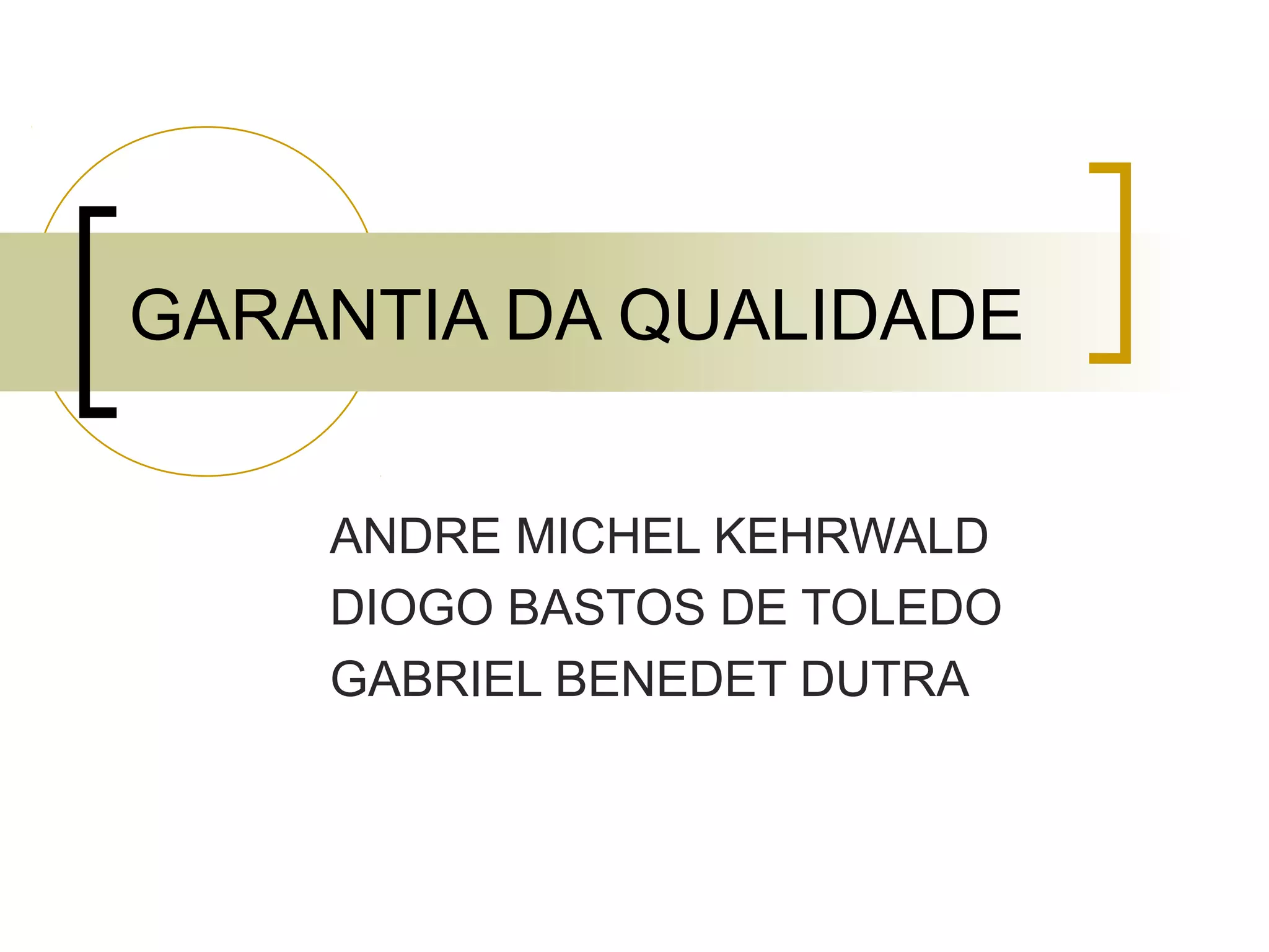 O documento discute os conceitos e práticas de garantia da qualidade, incluindo administração da qualidade, política da qualidade, objetivos da qualidade, sistemas de qualidade, organização da qualidade, planejamento da qualidade, controle de qualidade ofensivo, qualidade de projeto, qualidade de conformidade, desdobramento da qualidade, ciclo de garantia de qualidade, garantia da qualidade no processo de produção, garantia da qualidade no uso do produto, auditoria da qualidade, implantação da organização da garantia da qualidade e objetivos da