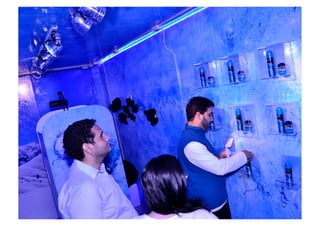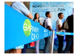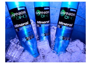 O documento descreve uma campanha da Garnier para divulgar seu novo desodorante BI-O Mineral Exteme Ice, criando uma experiência de "Ice Lounge" onde os clientes podiam sentir a sensação térmica do produto e tirar fotos simulando frio extremo. A ação ocorreu nas estações Central do Brasil no Rio de Janeiro e Tietê em São Paulo em agosto e outubro de 2012, impactando direta e indiretamente milhares de pessoas.