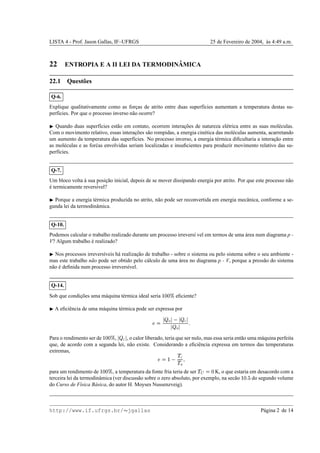 Este documento fornece uma lista de exercícios resolvidos de termodinâmica preparados por um professor de física teórica da UFRGS. A lista contém 22 questões e problemas sobre entropia e a segunda lei da termodinâmica, com respostas detalhadas. O documento também fornece informações biográficas sobre o professor e instruções sobre como enviar comentários ou sugestões.