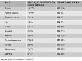 O documento descreve a história da gasolina, desde sua descoberta na década de 1850 até seu uso como combustível principal para automóveis no início do século XX. Detalha os processos iniciais de destilação do petróleo bruto para produzir gasolina e o desenvolvimento posterior de técnicas como cracking para aumentar a produção.