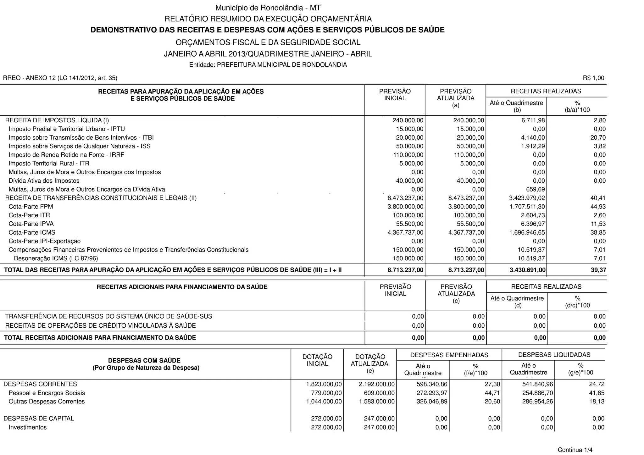 Este relatório resume as receitas e despesas com ações e serviços públicos de saúde do município de Rondolândia (MT) no primeiro quadrimestre de 2013. As receitas totais foram de R$3,4 milhões, correspondendo a 39,37% da previsão, enquanto as despesas empenhadas somaram R$598 mil, equivalente a 24,53% da dotação. A aplicação em ações de saúde representou 16,72% das receitas, abaixo do limite mínimo constitucional de 15%.