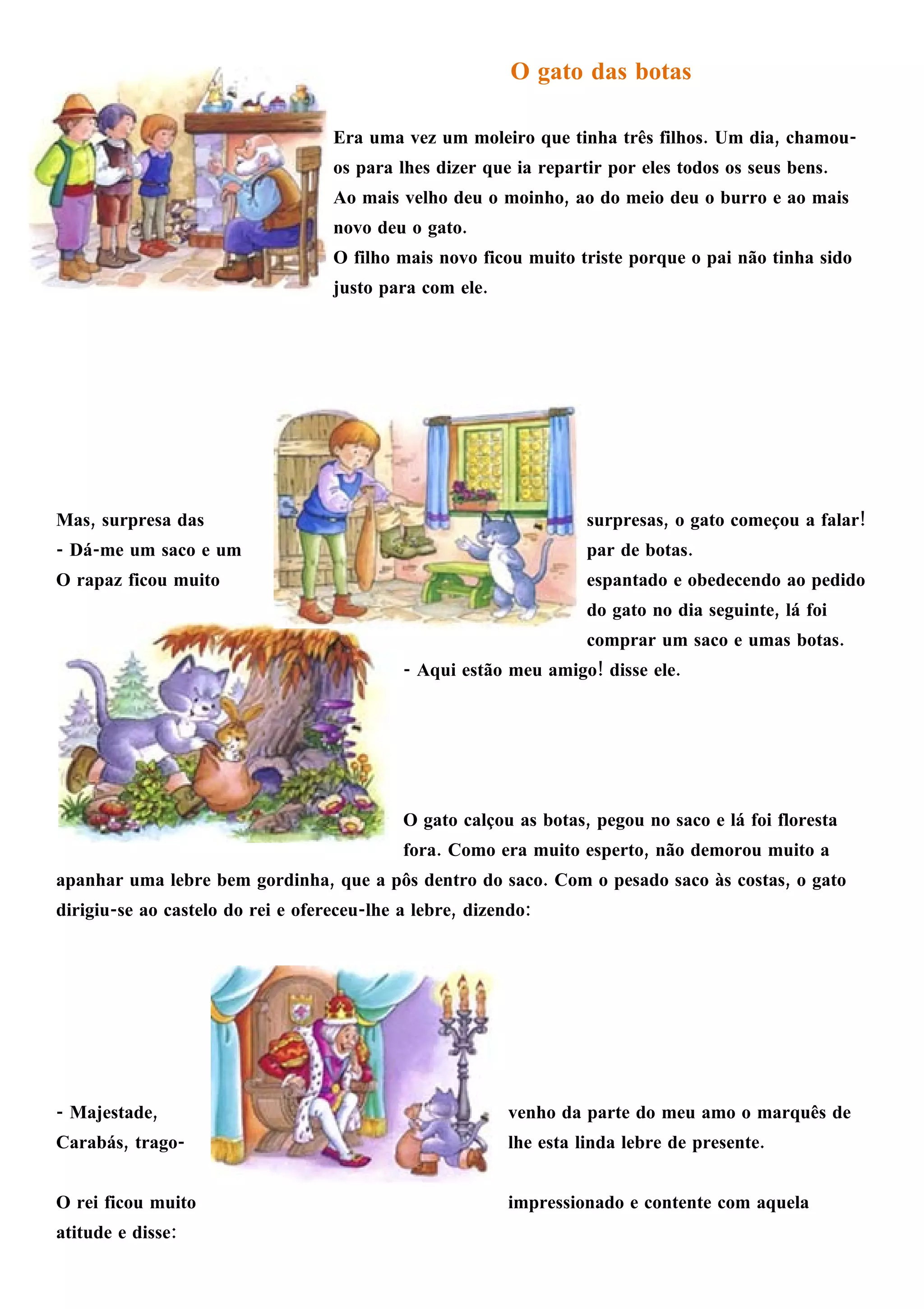 O gato das botas recebeu um par de botas e um saco do filho mais novo de um moleiro. Ele usou isso para se fazer passar pelo Marquês de Carabás e oferecer presentes ao rei, ganhando riquezas e status para seu dono. Quando o dono se casou com a princesa, o gato revelou que havia derrotado um gigante, fazendo com que seu dono se tornasse o proprietário de um grande castelo.