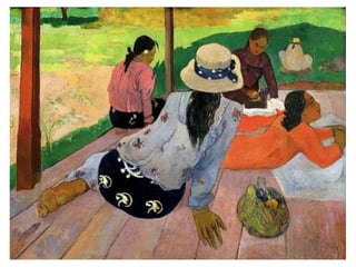 Paul Gauguin, pintor francês nascido em 1848, viveu em vários países incluindo Peru, Dinamarca e Taiti e sua pintura é reconhecida por retratar a natureza de forma alegórica e decorativa, influenciada por gravuras japonesas, com formas dimensionais e estilizadas.