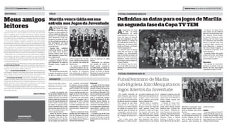 O documento fornece informações sobre os jogos de times de Marília em competições esportivas regionais. É anunciada a data e local dos próximos jogos do time adulto de futsal feminino e do time sub-18 de futsal feminino na Copa TV TEM. Também há detalhes sobre vitórias do time sub-18 de futsal feminino e do time sub-18 de vôlei masculino nos Jogos Abertos da Juventude.