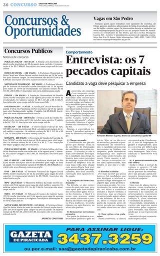 O documento discute 7 comportamentos que podem prejudicar as chances de um candidato em uma entrevista de emprego de acordo com um especialista em recursos humanos. São eles: chegar atrasado, se vestir de forma inadequada, demonstrar nervosismo excessivo, atender o celular durante a entrevista, usar gírias ou palavrões, ter uma postura corporal negativa e mentir.