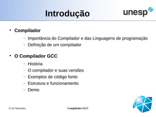 O documento descreve o compilador GCC, incluindo sua história, versões, estrutura e funcionamento. O GCC (GNU Compiler Collection) foi desenvolvido originalmente por Richard Stallman em 1987 para o projeto GNU. Ele é um compilador multiplataforma, de código aberto, que suporta várias linguagens como C, C++, Java e Fortran. O GCC realiza quatro etapas de compilação: pré-processamento, compilação, montagem e ligação. Sua estrutura inclui front-end, middle-end e back-end para análise, ot