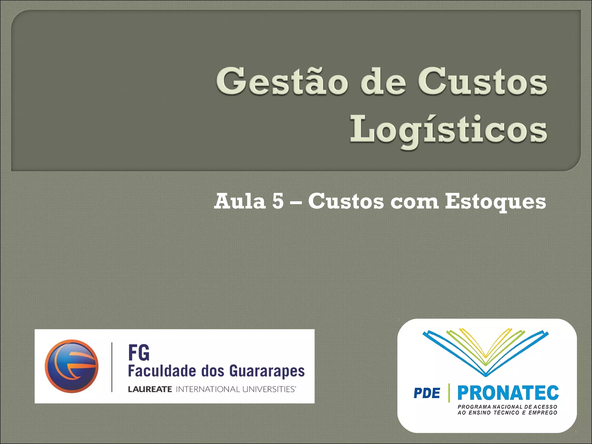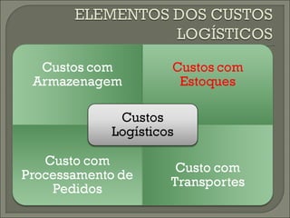 O documento discute os diferentes tipos de custos de estocagem que uma empresa deve considerar, como custo de oportunidade do capital parado, custos com impostos e seguros, custos com riscos de manter estoques e custos com faltas. Explica como calcular cada um desses custos usando métricas como estoque médio, custo unitário, taxas e índices.