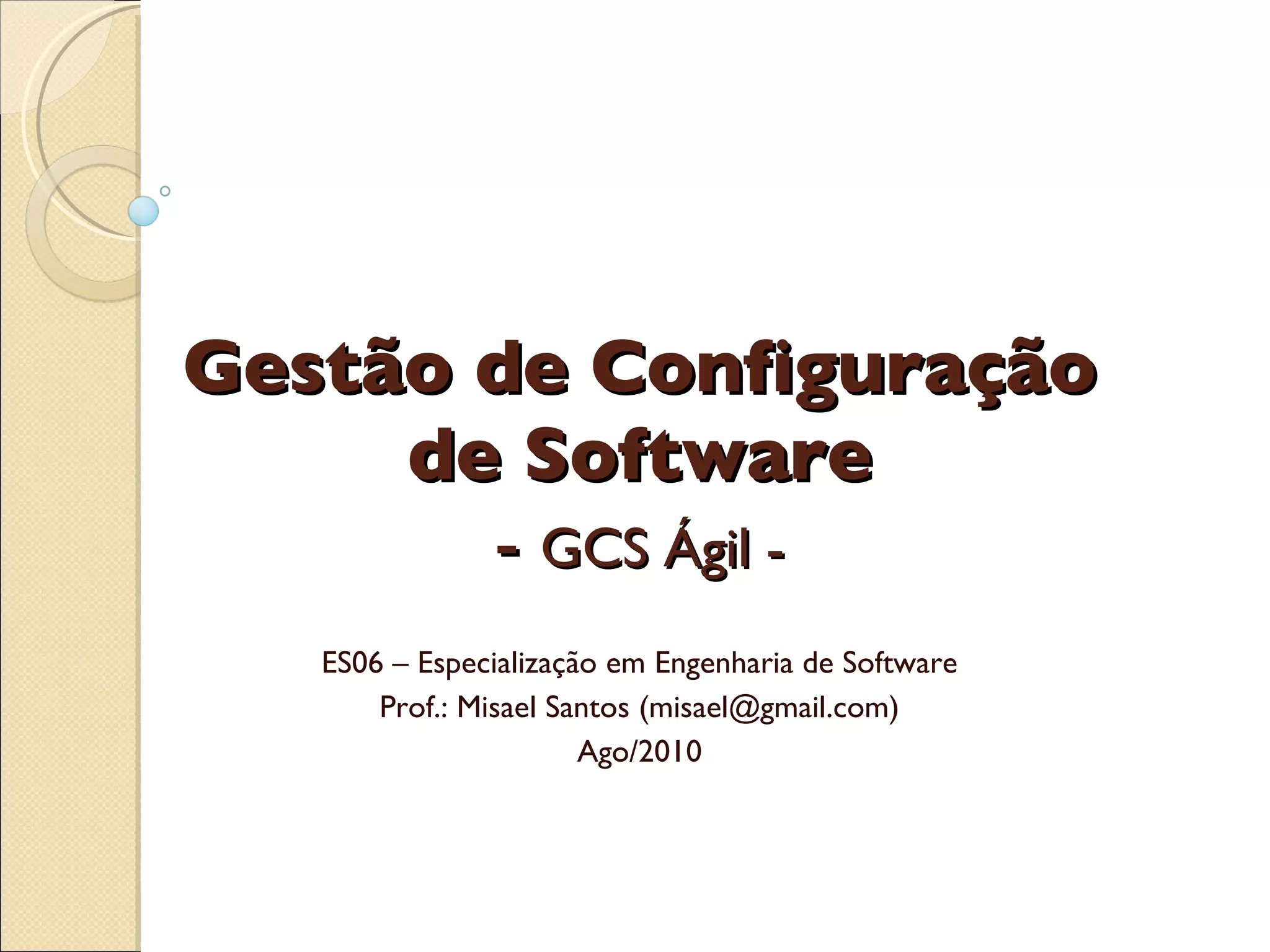 O documento discute gestão de configuração de software ágil, incluindo práticas como integração contínua e padrões de desenvolvimento ágil como Extreme Programming. Também aborda como aplicar princípios de gestão de configuração de forma enxuta e ágil para apoiar times de desenvolvimento ágil.
