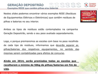 O documento descreve exemplos de resíduos de equipamentos elétricos e eletrônicos (REEE) que contêm pilhas e baterias. Instruções para as escolas separarem as pilhas/baterias dos equipamentos para fins de premiação com base no peso coletado de cada tipo de resíduo. Escolas que coletarem pelo menos 50kg de pilhas/baterias em fim de vida serão premiadas em 2014.