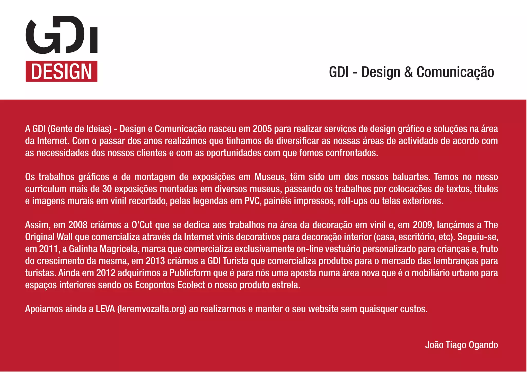 A gdi - design & comunicação, fundada em 2005, oferece serviços de design gráfico e soluções na internet, diversificando suas atividades ao longo dos anos para atender às necessidades dos clientes. A empresa destaca-se na montagem de exposições em museus e possui diversas marcas, como a O'cut e Galinha Magricela, que comercializam produtos decorativos e vestuário infantil, respectivamente. Além disso, a gdi também oferece serviços de design para empresas, e possui portfólio sólido incluindo trabalhos com renomados museus.
