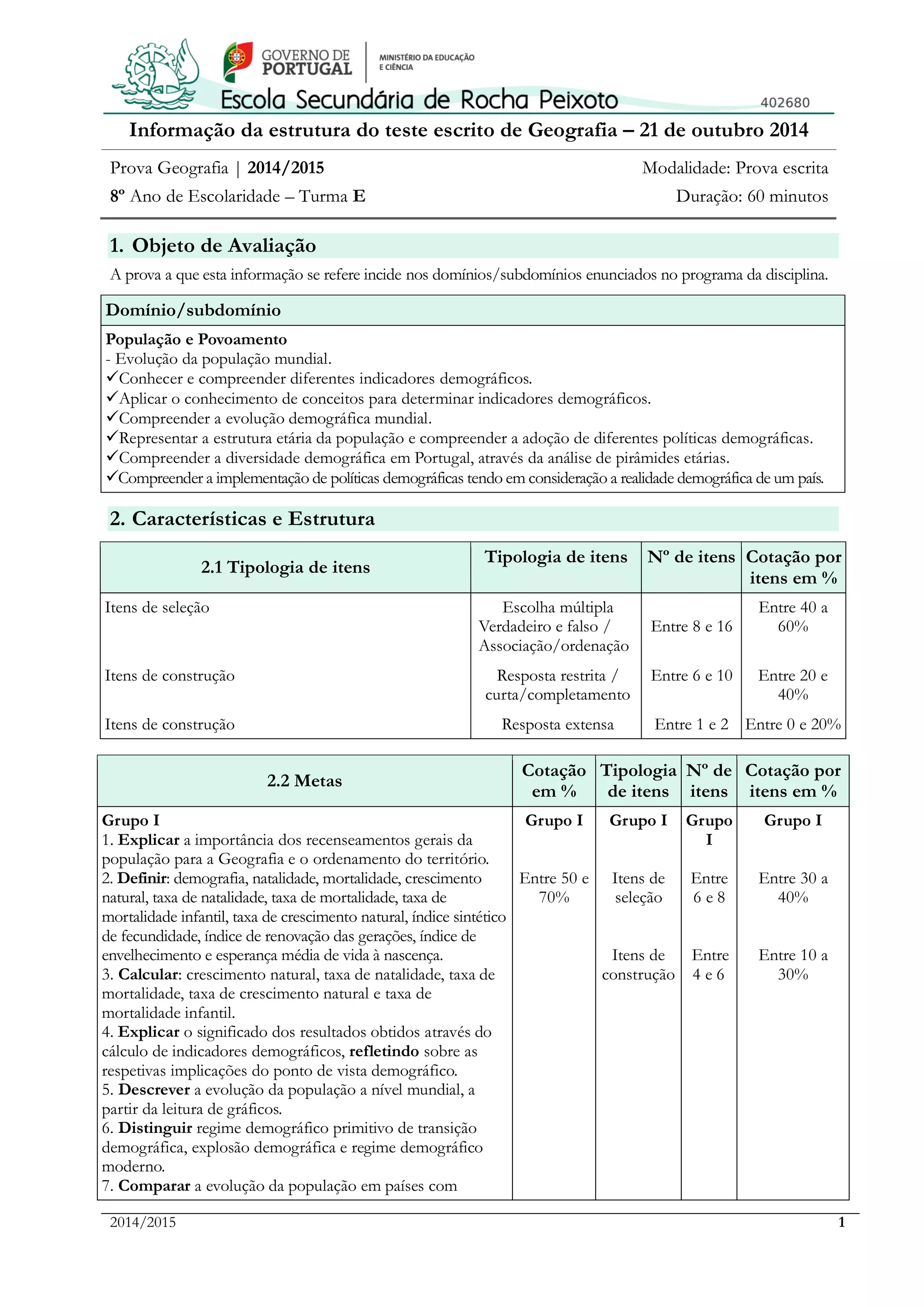 Este documento fornece informações sobre uma prova escrita de Geografia para alunos do 8o ano sobre o tópico População e Povoamento. A prova terá itens de seleção e construção sobre indicadores demográficos, evolução da população mundial e regimes demográficos. Os alunos poderão usar calculadora e folhas de resposta, mas não corretor durante a prova de 60 minutos.