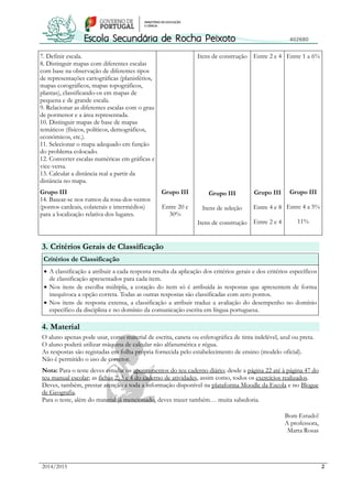 Este documento fornece informações sobre um teste escrito de Geografia para alunos do 7o ano, incluindo o conteúdo coberto, estrutura do teste, critérios de classificação e material permitido. O teste irá avaliar os alunos em três domínios principais: representações da Terra, mapas e localização. Ele consistirá em questões de múltipla escolha e respostas curtas, e irá cobrir tópicos como projeções cartográficas, escalas de mapas e uso de pontos cardeais.