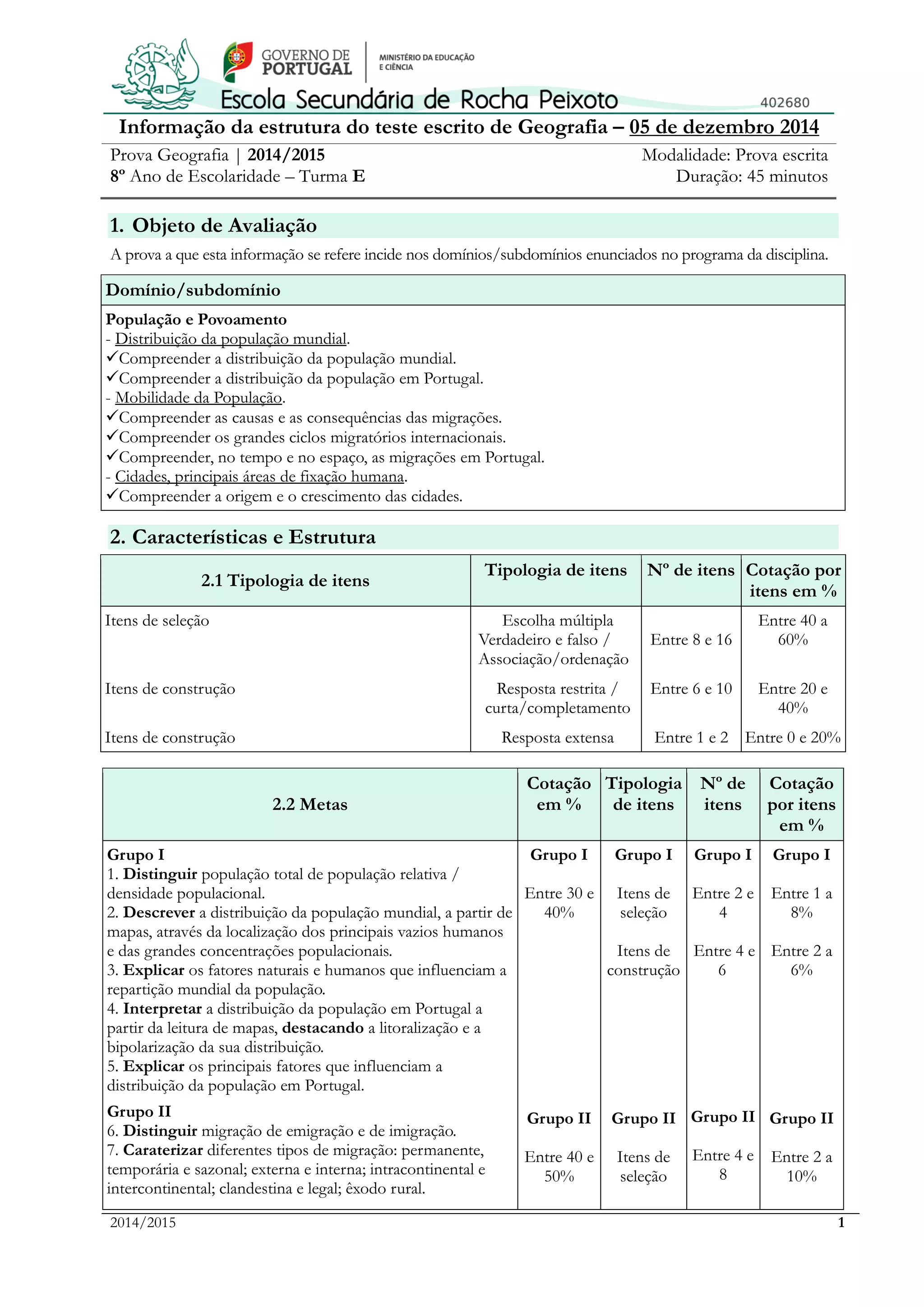 Este documento fornece informações sobre uma prova escrita de Geografia para alunos do 8o ano sobre População e Povoamento. A prova terá itens sobre a distribuição da população mundial e em Portugal, migrações e crescimento das cidades. Será composta por itens de escolha múltipla e construção e terá uma duração de 45 minutos.
