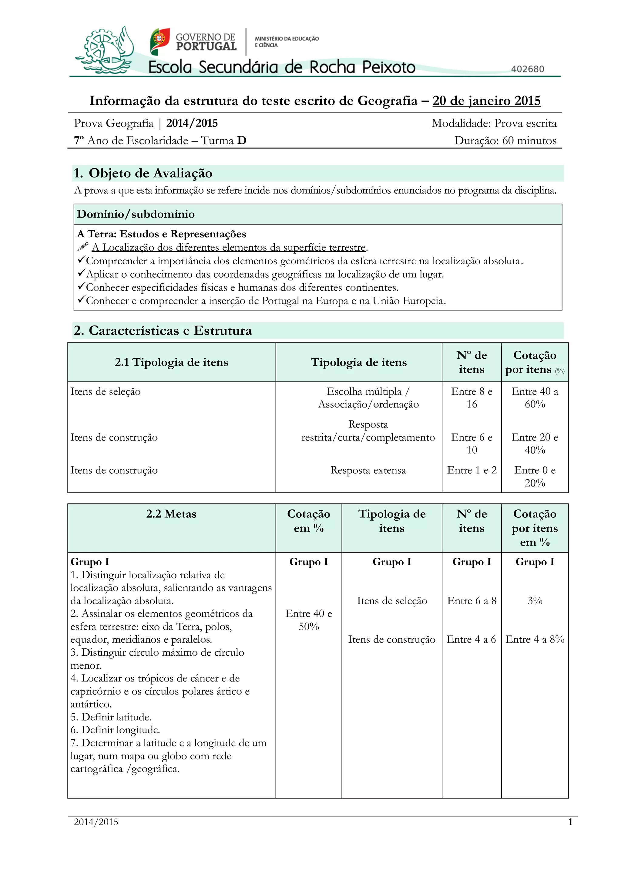 Este documento fornece informações sobre uma prova escrita de Geografia para alunos do 7o ano. A prova irá avaliar dois domínios: 1) A Terra: Estudos e Representações e 2) A Localização dos diferentes elementos da superfície terrestre. A prova terá itens de escolha múltipla, associação e resposta curta e extensa. Os alunos devem estudar seus cadernos, manuais escolares e materiais online para se preparar.