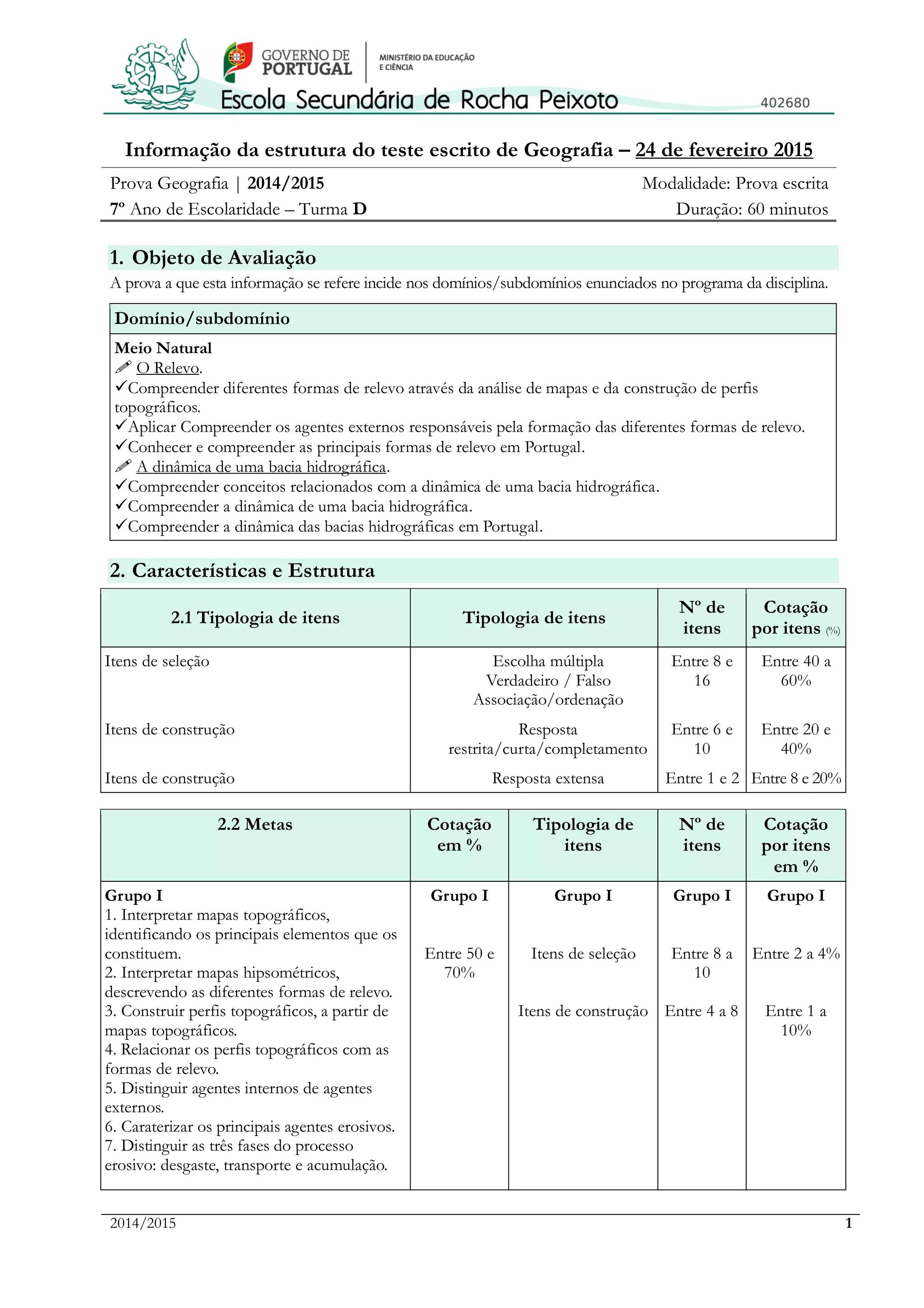 O documento detalha a estrutura e os critérios de avaliação da prova escrita de geografia do 7º ano, com enfoque nos domínios do meio natural e da dinâmica das bacias hidrográficas. A prova inclui diferentes tipologias de itens, como escolha múltipla e respostas extensas, e os alunos devem usar apenas caneta para escrever. Os alunos são orientados a estudar materiais específicos e utilizar recursos disponíveis na plataforma da escola para se prepararem para a avaliação.