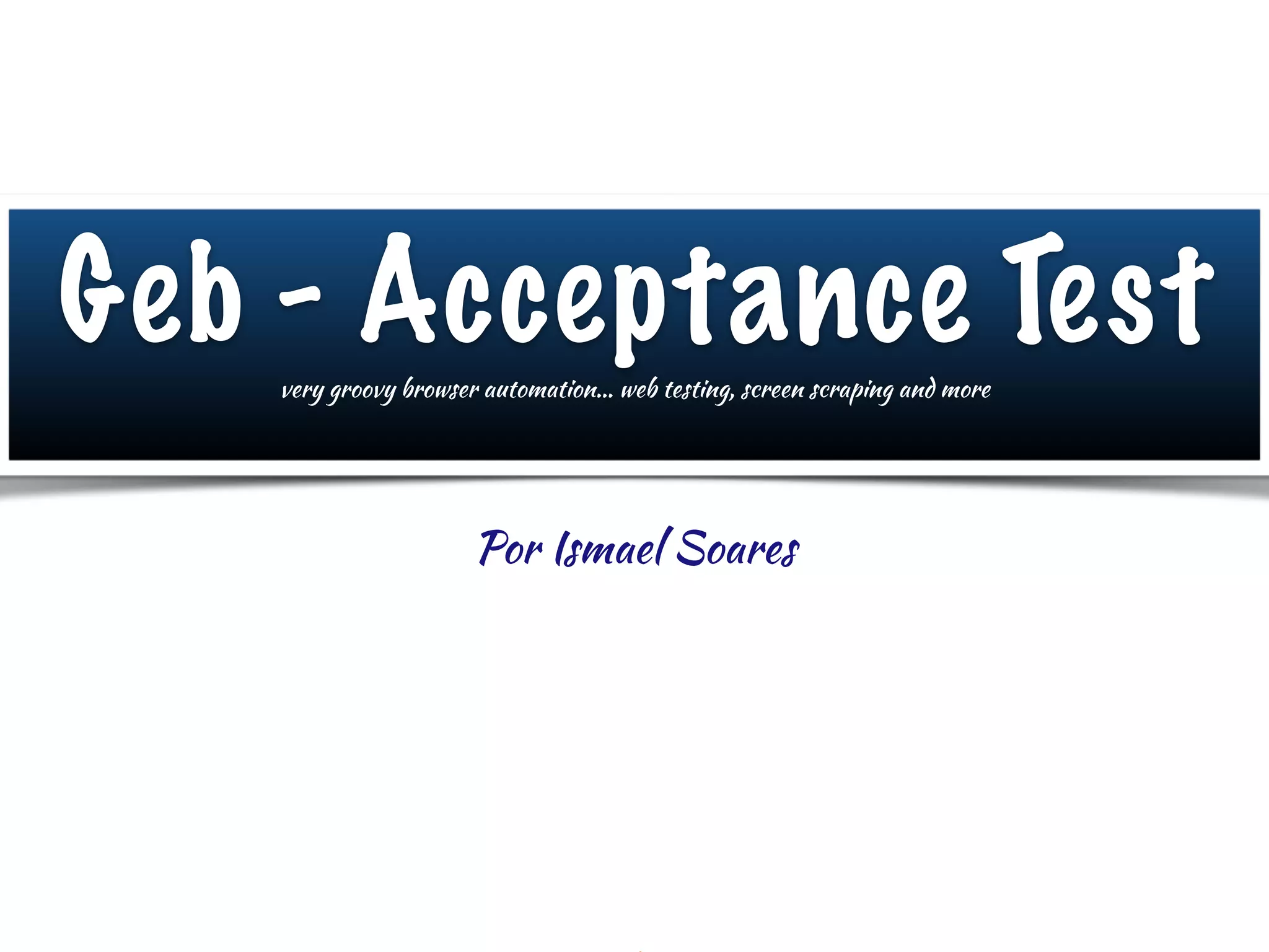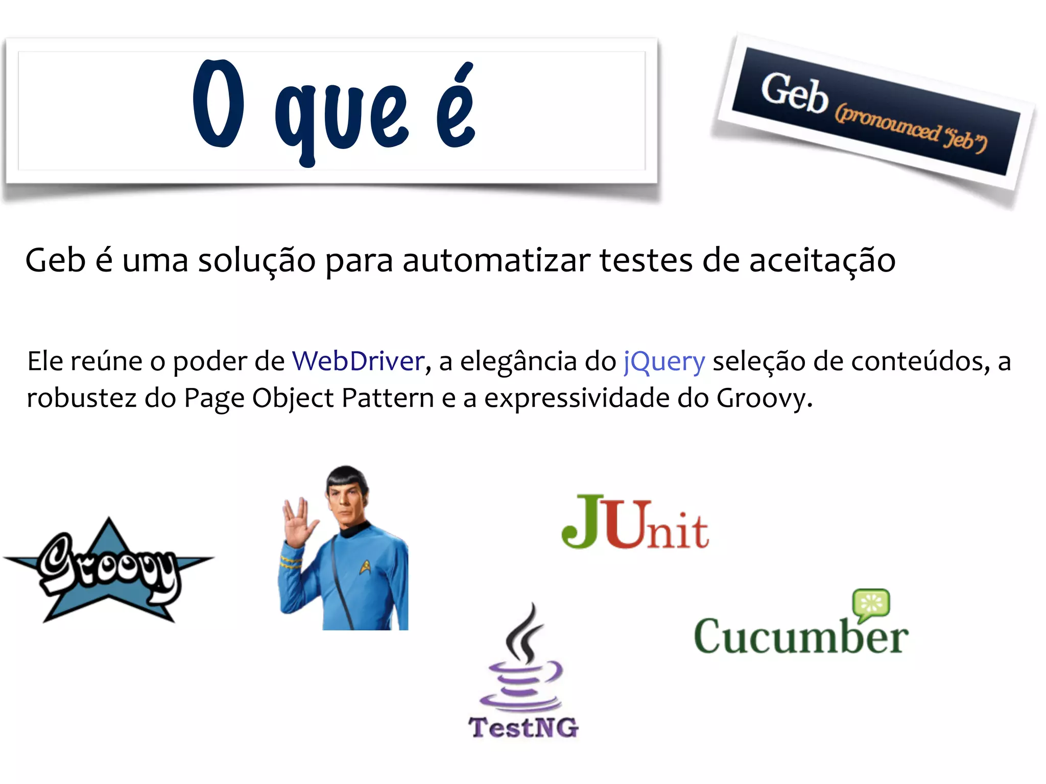 O documento apresenta o Geb, uma ferramenta para automatizar testes de aceitação que combina WebDriver, jQuery e o padrão de objeto de página com a linguagem Groovy. Ele simplifica a escrita de testes e oferece uma API intuitiva para interação com conteúdos na web. A documentação é considerada boa e está disponível no site oficial.