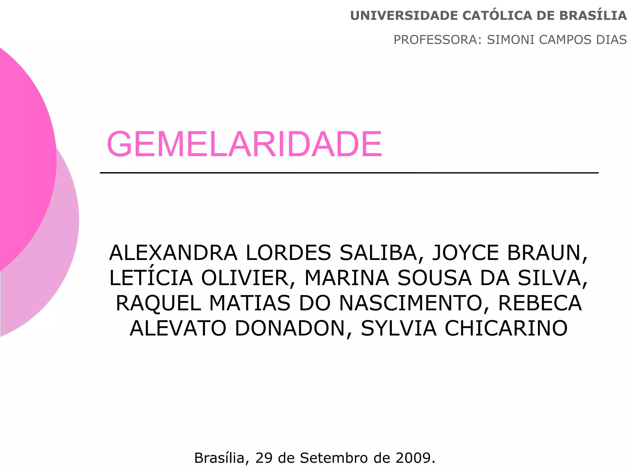 Este documento discute a formação de gêmeos, incluindo fatores que influenciam a gemelaridade, como etnia, idade da mãe e hereditariedade. Aborda os tipos de gêmeos - dizigóticos e monozigóticos - e como cada um se forma e se implanta no útero. Também examina anomalias e desvios na formação, como a síndrome da transfusão feto-fetal e gêmeos conjugados, além dos riscos associados à gravidez múltipla.
