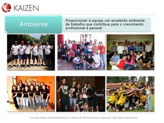 A empresa Kaizen Consultoria e Serviços é uma integradora de TI fundada em 1995 que emprega cerca de 180 pessoas, a maioria da Geração Y. A empresa valoriza a ética, o ambiente de trabalho, a qualidade, a responsabilidade social e a lucratividade. Ela oferece diversos benefícios e atividades para promover o engajamento e bem-estar de seus funcionários.