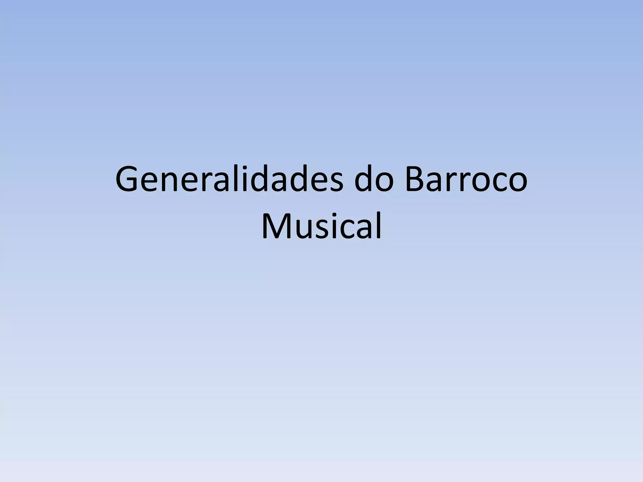 Três estilos musicais dominantes no Barroco: italiano, francês e alemão. Características incluem contrastes dinâmicos, ornamentação, grandiosidade e desenvolvimento de gêneros como ópera e concerto. O Barroco viu o progresso da harmonia, surgimento de música dramática e instrumental independente.