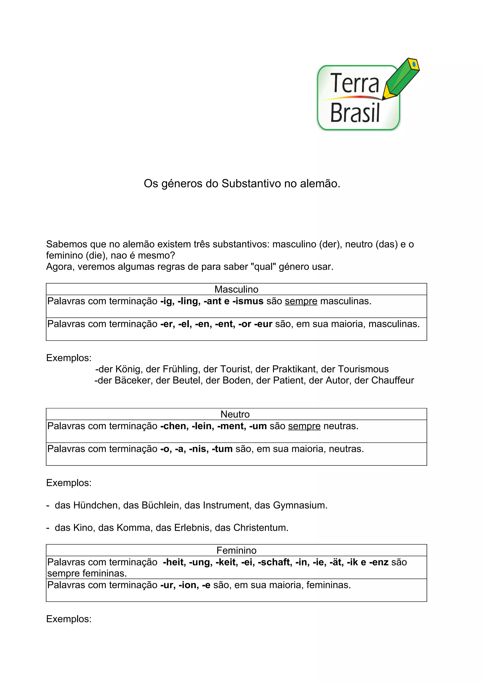 O documento descreve as regras gerais para determinar o gênero gramatical (masculino, feminino ou neutro) de substantivos em alemão. Ele lista terminações comuns que indicam cada gênero e fornece exemplos de palavras para ilustrar as regras.