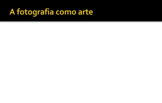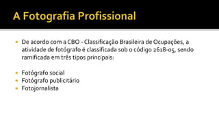 O documento classifica e descreve os principais tipos de fotografia, incluindo fotografia social, fotojornalismo, publicitária, científica e fine art. Apresenta exemplos históricos e atuais de cada categoria, mostrando suas características e aplicações.