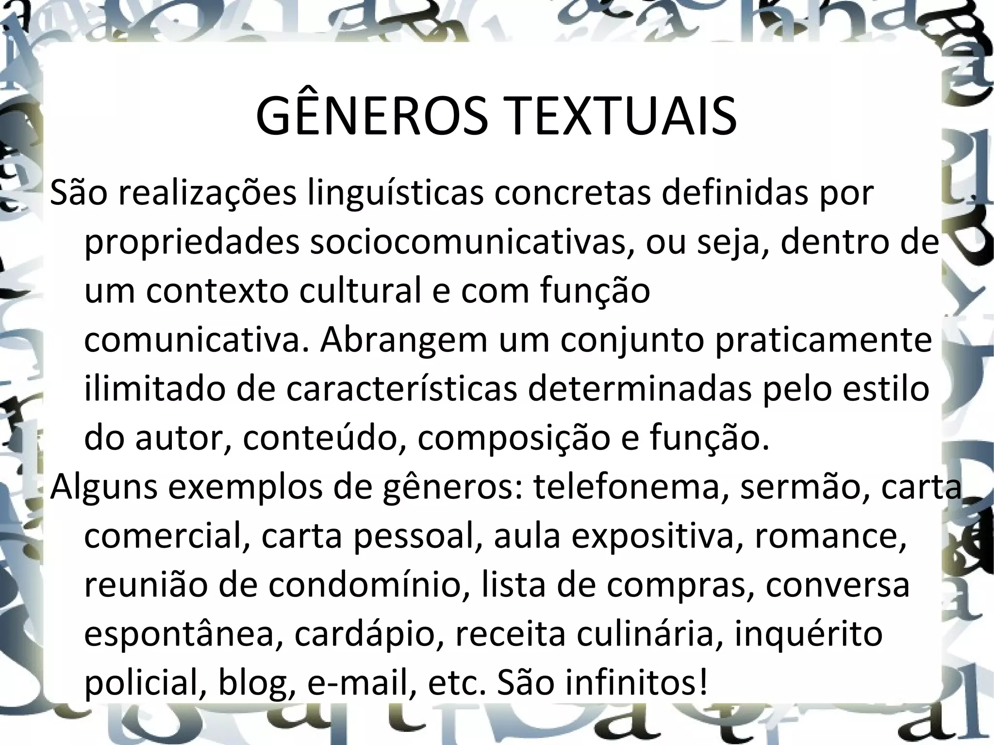 Gêneros textuais são definidos por suas propriedades sociocomunicativas e contexto cultural. Exemplos incluem notícias, cartas, listas de compras. Uma notícia é um gênero jornalístico que busca manter o leitor informado de forma objetiva por meio de elementos como manchete, lide e corpo.