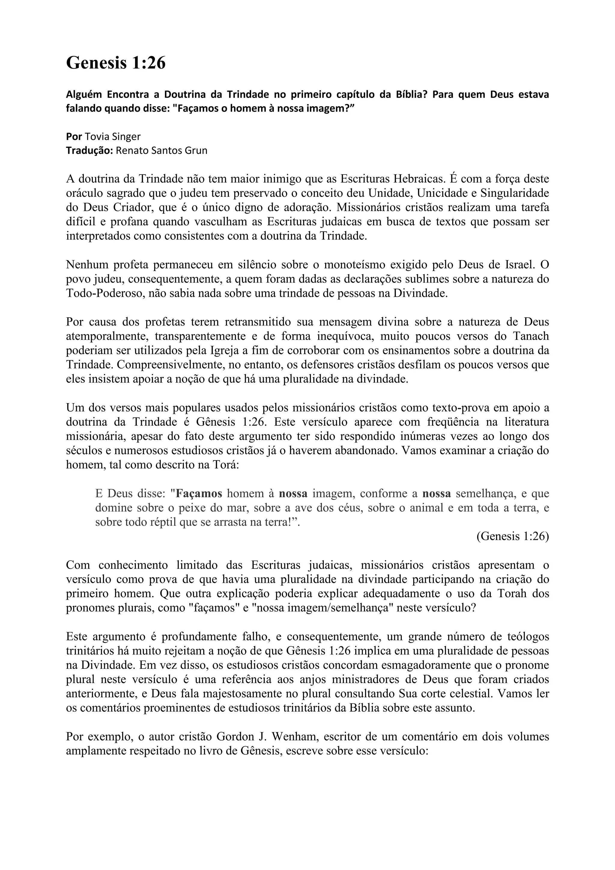 Gênesis 1:26 é frequentemente citado por missionários cristãos como prova da doutrina da Trindade, mas estudiosos bíblicos cristãos rejeitam amplamente essa interpretação. Eles concordam que o uso do plural nesse versículo se refere a Deus falando majestosamente aos anjos, não a uma pluralidade na divindade.