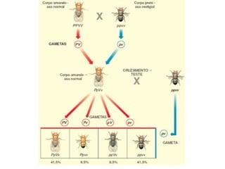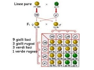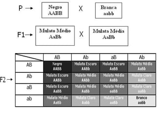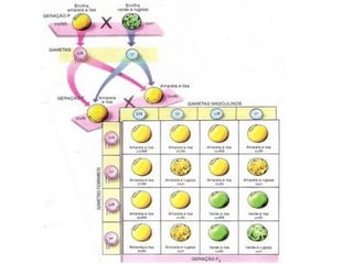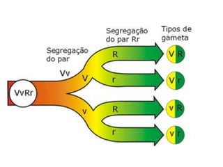O documento descreve os principais conceitos da genética de Mendel, incluindo suas leis e experimentos com ervilhas. Mendel observou que características hereditárias são determinadas por fatores que se separam na formação dos gametas e são transmitidos de forma independente, resultando em proporções previsíveis na descendência. Suas descobertas estabeleceram os fundamentos da genética clássica.