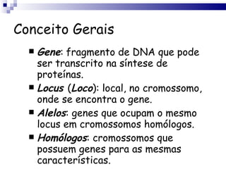 1) Definições de termos como gene, locus, alelos e herança ligada ao sexo.
